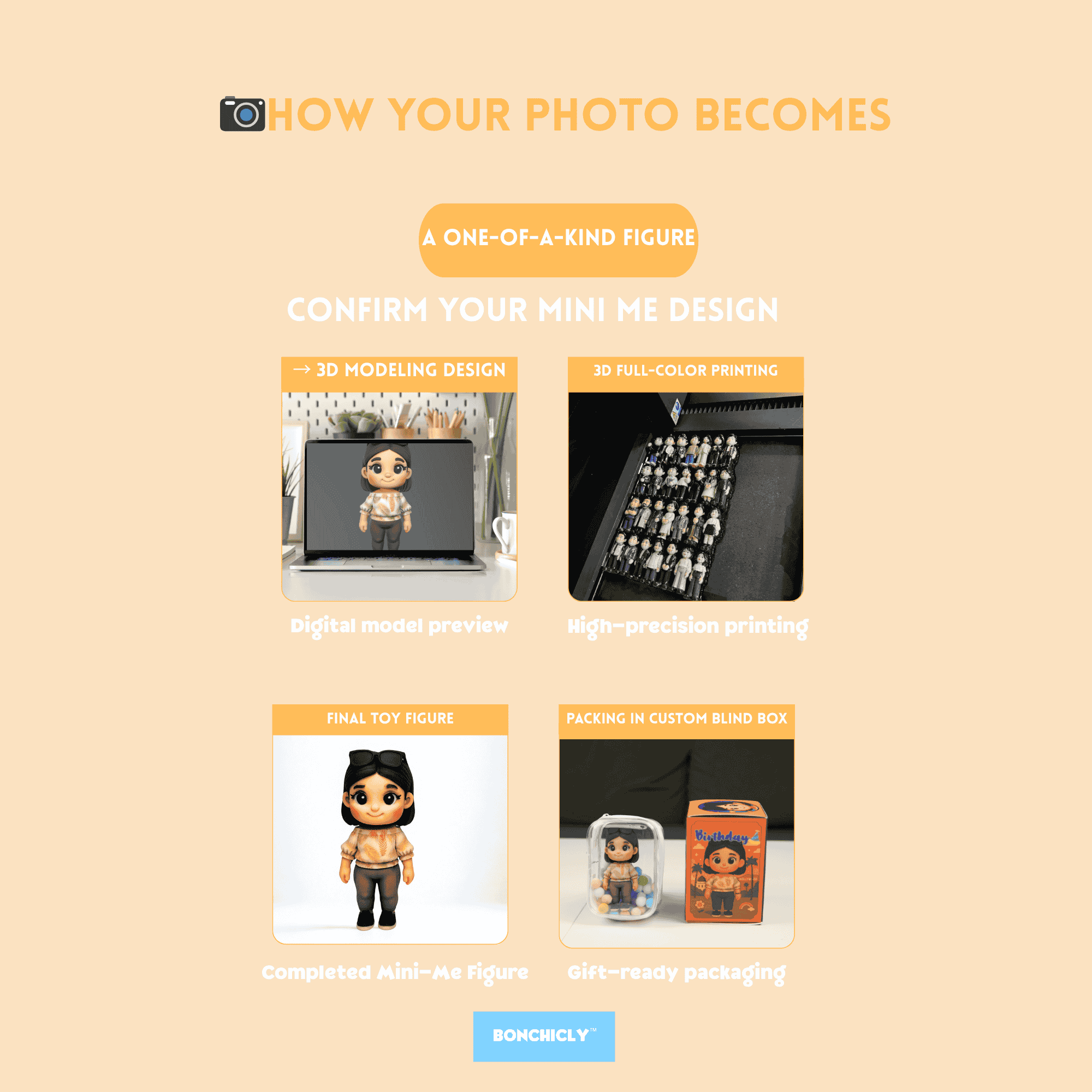 Each 3D full-color printed custom action figure from Bonchicly is a unique keepsake, a miniature reminder of your most cherished memories. Donβt wait! Click βAdd to Cartβ now and letβs transform your photo into a 3D full-color treasure! β¨