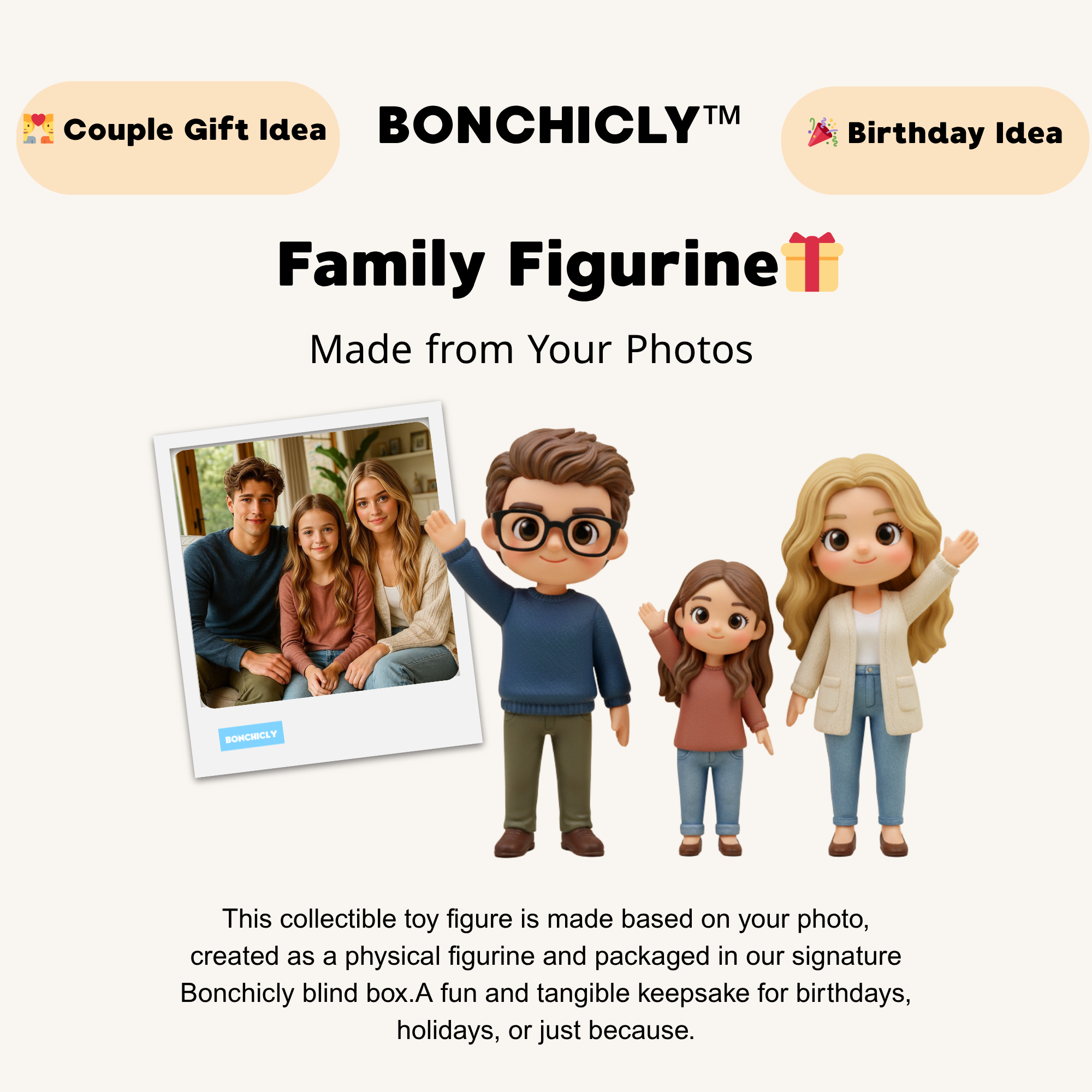 Create your own BONCHICLY™ “Mini Family” collectible — a heartwarming keepsake that captures your loved ones in adorable toy form.